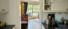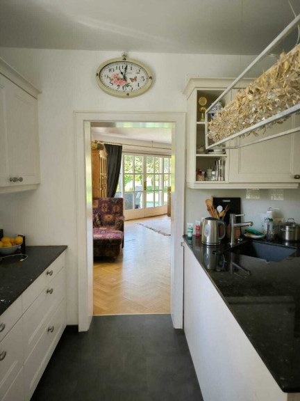 Eingangsbereich: Garderobe, WC und Flur, Stiegenauf- und -abgang, Küche und Wirtschaftsraum mit Zugang zur Garage und in den Garten. Heller Wohn- und Essbereich mit Kachelofen sowie direktem Zugang zur Terrasse und in den parkähnlich angelegten Garten.