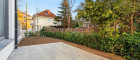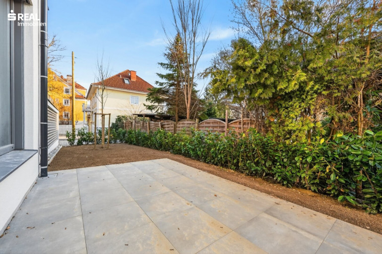 Eine Terrasse mit großzügigem Gartenanteil lädt zum Entspannen im Freien ein und bietet Platz, um die frische Luft zu genießen und den Ausblick zu schätzen.