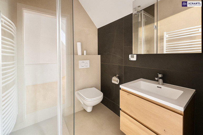 Das Badezimmer mit Badewanne, Dusche, WC und Tageslichtfenster überzeugt durch hochwertige Ausstattung und geschmackvolles Design. Ein Abstellraum mit Waschmaschinenanschluss sowie ein separater Einlagerungsraumergänzen das Raumangebot.