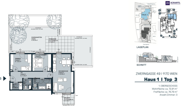 72,91 m² Wohnfläche | 76,79 m² Freifläche | 3 Zimmer | Provisionsfrei!