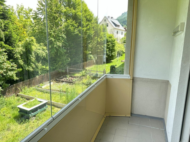 Der ostseitige Balkon ist mit Glastüren ausgestattet, die vollständig geöffnet werden können, und bietet einen schönen Ausblick in die Natur. Zusätzlich steht ein hausintern zugeteilter Gartenanteil zur Verfügung, der ideal für entspannte Stunden im Freien ist.