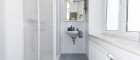 - Modernes Badezimmer: Mit Dusche, Waschbecken, Spiegelschrank und Waschmaschinenanschluss.