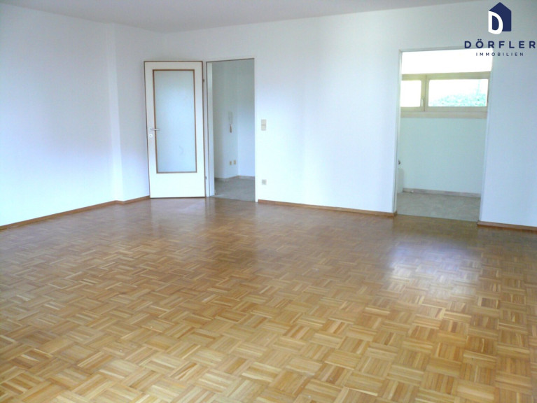 Wohnbereich und Schlafzimmer sind mit Parkettboden belegt.