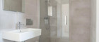 - Badezimmer mit Dusche, Waschbecken, Toilette und Waschmaschinenanschluss