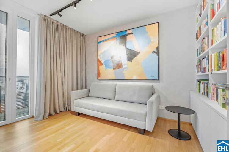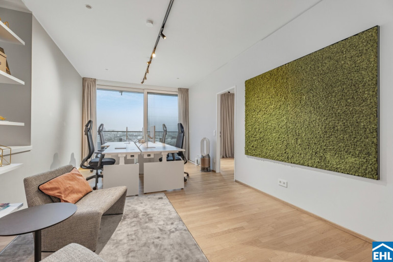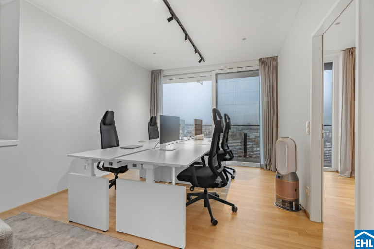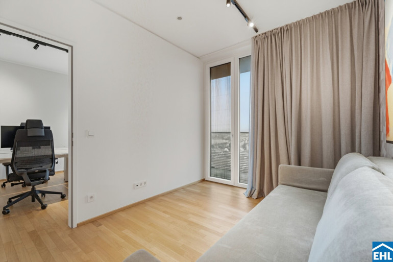 Lichtdurchflutet durch großzügige Fensterflächen eröffnet sie ein Panorama auf die Wiener Hausberge. Besonders in den Abendstunden, wenn die Sonne langsam hinter den Hügeln versinkt und den Himmel in warme Gold- und Rottöne taucht, entsteht ein beinahe magisches Schauspiel. Die großzügige Freifläche erweitert den Wohnraum ins Freie – perfekt für stille Momente über den Dächern der Stadt.