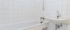 Das geflieste Bad ist mit einer Badewanne und Waschbecken ausgestattet – ein Ort zum Entspannen nach einem langen Tag.