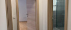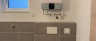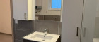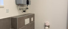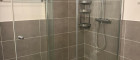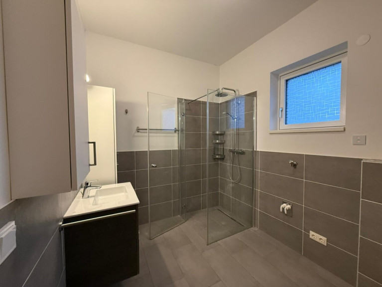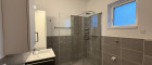 - Badezimmer mit Dusche, Waschbecken, Waschmaschinenanschluss und WC