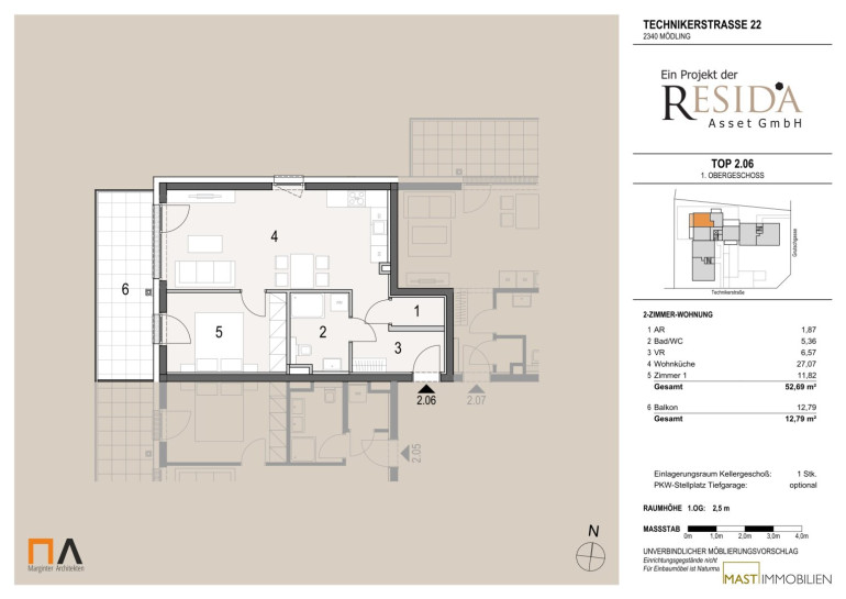Die Wohnung befindet sich im 1. Obergeschoss und verfügt über 52,69 m² Wohnfläche + einen 12,79 m² großen Balkon.