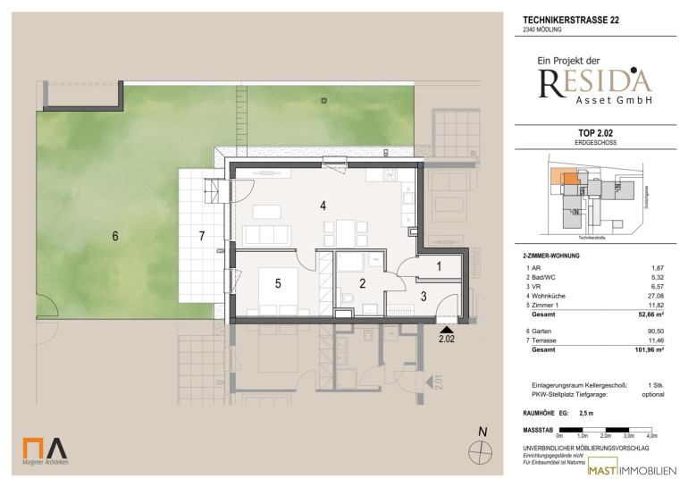 Die Wohnung befindet sich im Erdgeschoss und verfügt über 52,66 m² Wohnfläche + eine 11,46 m² große Terrasse und einen 90,50 m² großen Garten.