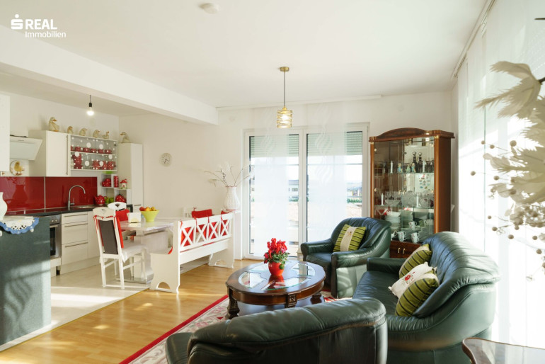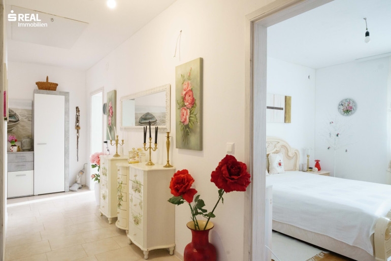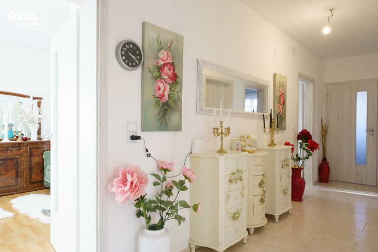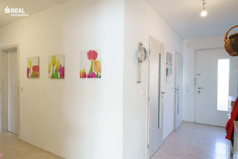 Über die Sicherheitstüre betritt man den Hausflur und hat alle Räumlichkeiten separat erreichbar, angefangen von der Toilette mit Waschbecken, dem Kabinett, der Wohnküche, einer Speis, einem Abstellraum, Schlafzimmer mit Schrankraum, Büro/Kinderzimmer und dem Dusch-/Wannenbad mit WM-Anschluss und Doppelwaschbecken (Anschlüsse für eine zweite Toilette im Bad vorhanden). So ist die Wohnfläche von ca. 101m² sehr übersichtlich und kompakt, perfekt ausgenutzt und durch die großen Fenster und die Himmelsausrichtung schön hell und lichtdurchflutet.