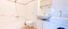 - Badezimmer mit Badewanne, Waschbecken, Waschmaschinenanschluss und Toilette