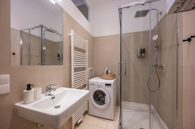 - Badezimmer mit Dusche und Waschmaschine
