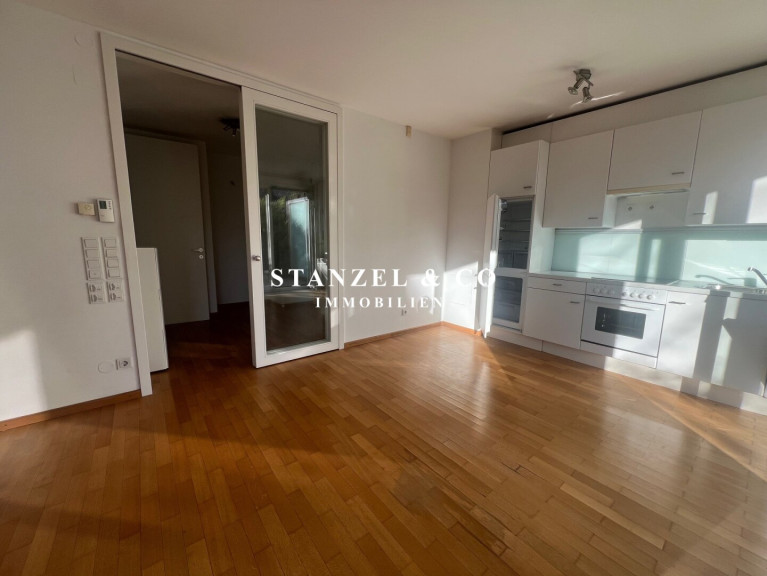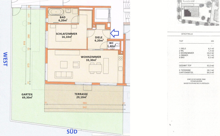 Vom 6m² Vorzimmer gelangt man in das 33m² große, südwestseitige Wohnesszimmer mit offener Küche. Das Wohnesszimmer ist durch große Terrassentüren mit der 29m² großen Südterrasse und dem dahinter liegenden 69m² großen, Südwestgarten verbunden.