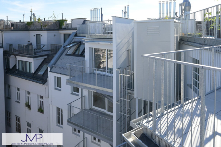 Die sehr helle 2-Zimmerwohnung ist ca. 71,46m² groß. Sie ist ost-westorientiert und besitzt neben einem schönen Balkon, der in den ruhigen Innenhof hinein orientiert ist, ein 34m² große Dachterrasse, mit einem schönen 360° Stadtblick!