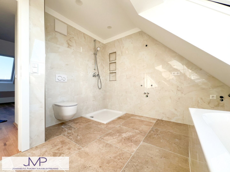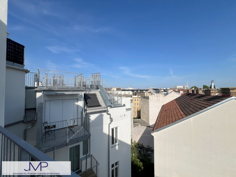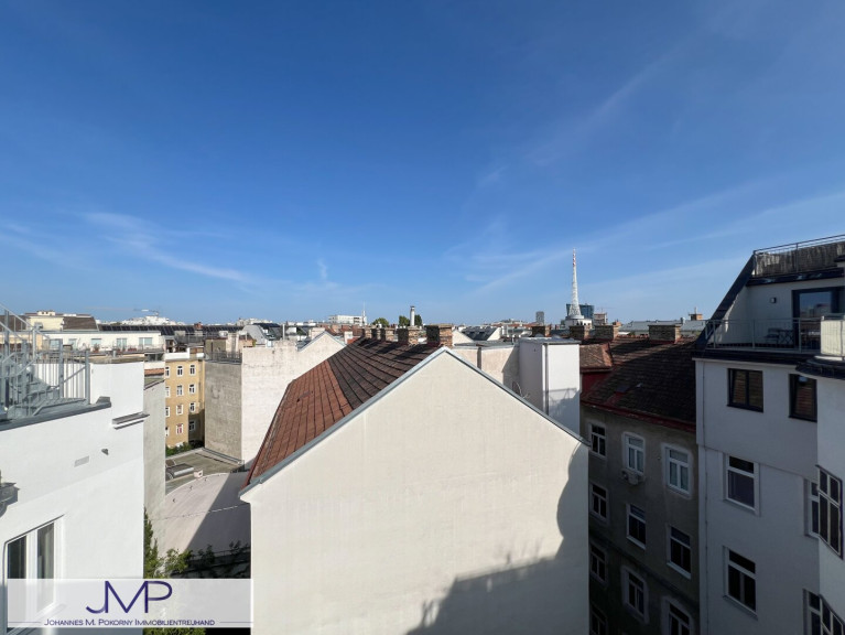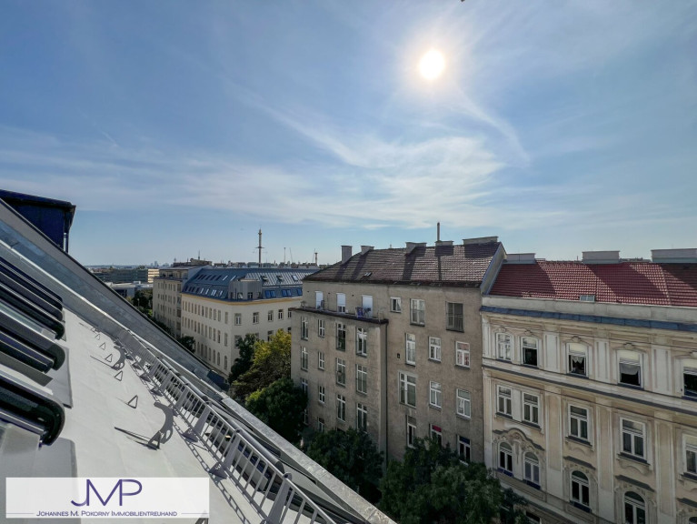 Der private Bereich ist über einen weiteren Vorraum erreichbar. Von hier aus gelangt man in das uneinsichtige Bad mit eigenem Fenster, das mit einer großen Dusche und einem WC ausgestattet ist. Das daran anschließende Schlafzimmer ist nach Westen orientiert und ca. 17,64m² groß. Von hier hat man bereits einen schönen Blick über die Dächer von Wien.