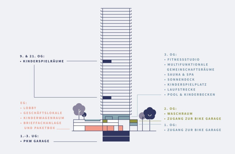 In dem Wohnturm befindet sich ein Outdoor-Pool mit Liegemöglichkeiten zum entspannen, ein Sonnendeck, Kinderwagen- und Fahradräume, Laufstrecke im Dritten Obergeschoss, Paketboxanlage, multifunktionale Gemeinschaftsräume, Indoor- und Outdoor-Kinderspielplätze, Fitnessräume, Spa und Saunabereich, Waschküche, Foyer mit Concierge-Service / Rezeption beim Eingang, attraktive Außenanlagen mit parkähnlichen Freiflächen, Gastronomie, Shops und Lebensmittelhandel.