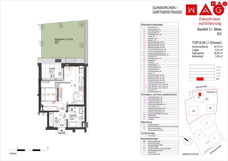 Am ehemaligen Sportplatz in der Gärtnerstraße in Gunskirchen errichtet die WAG drei moderne Wohngebäude mit insgesamt 60 geförderten Mietwohnungen und einer Tiefgarage mit 81 Stellplätzen. Die Anlage entsteht in nachhaltiger Hybridbauweise und bietet Wohnraum für unterschiedliche Lebenssituationen.