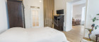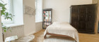 → maßgefertigte Tischlerküche mit sichtbaren Ziegeln, Vintage-Vollholzfronten, Marmorarbeitsplatte und integrierter Beleuchtung - Großzügiges Schlafzimmer mit Platz für Doppelbett, Kleiderschrank und Kommode