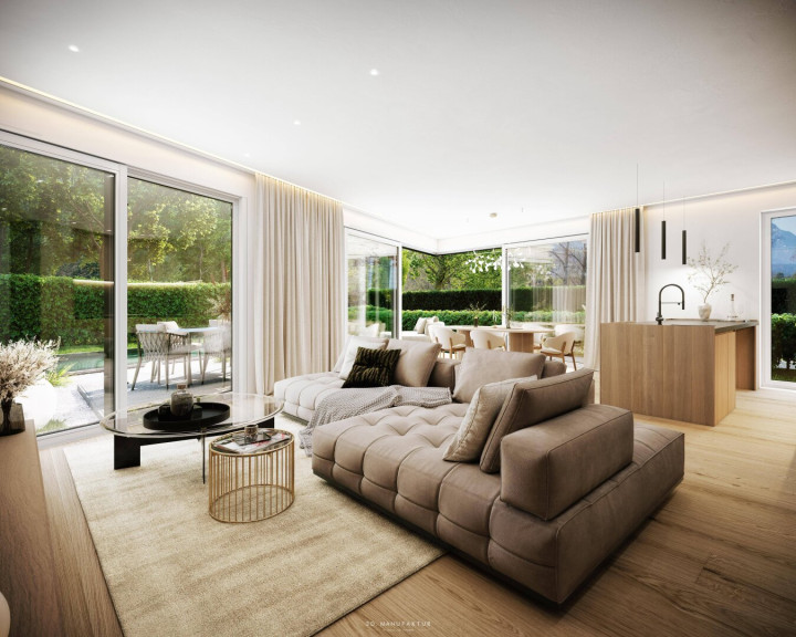 Diese Gartenwohnung kombiniert moderne Architektur, hochwertige Ausstattung und eindrucksvolle Außenflächen zu einem Wohnjuwel, das gleichermaßen stilvoll wie behaglich ist.