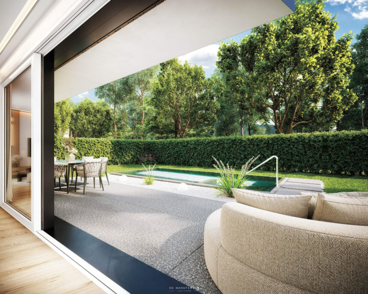 Auch hier sorgt der direkte Zugang auf die Terrasse für ein offenes, lichtdurchflutetes Wohngefühl. Der Grundriss ist offen und luftig gestaltet. Das Herzstück bildet der nahezu 56 m² große Wohn-Ess-Bereich mit integrierter Küche und einem separaten Speis- bzw. Abstellraum. Großzügige, bodentiefe Fenster fluten den Raum mit Tageslicht und schaffen einen fließenden Übergang auf die weitläufige Terrasse und den anschließenden Privatgarten – ein harmonischer Rückzugsort für Entspannung, Genuss und individuelle Gestaltungsmöglichkeiten. Auf Wunsch kann zudem ein Pool realisiert werden; dieser ist optional und nicht im Kaufpreis enthalten.