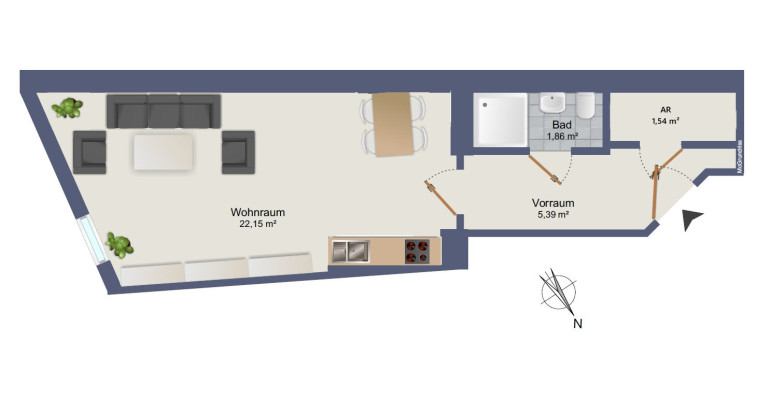 - Abstellraum (AR): ca. 1,54 m² groß und sorgt für wertvollen Stauraum innerhalb der Wohnung.