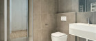 - Badezimmer mit Dusche, Waschbecken, Waschmaschinenanschluss und Toilette