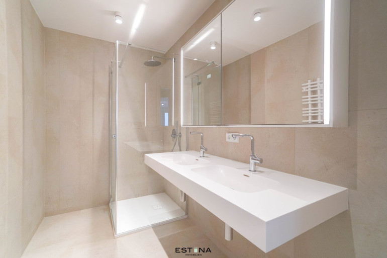- Badezimmer mit Walk-In Dusche, Doppelwaschbecken und Waschmaschinenanschluss