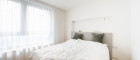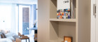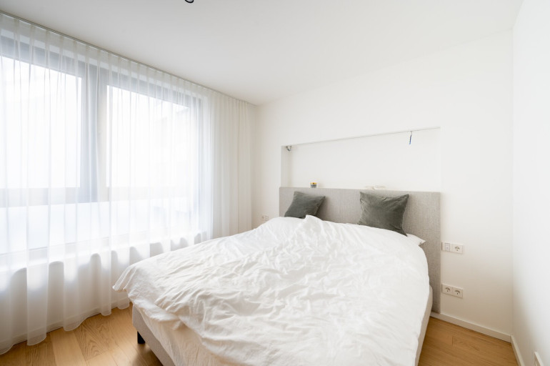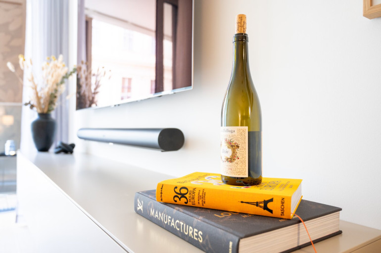 Im vierten Obergeschoß gelegen, zeichnet sich diese Wohnung durch ihre einzigartige und komfortable Anordnung aus. In den hellen und ruhigen Innenhof ausgerichtet, gibt es zwei Zimmer mit großzügigen Fensterflächen. Das Schlafzimmer ist möbliert (ein neues Hotelbett der Hotelkette SOFITEL, nicht am Foto abgebildet, bezogen im POLIFORM-Stoff des Sofas im Wohnzimmer ist im Preis inbegriffen), die Wand hinter dem Bett indirekt beleuchtet.