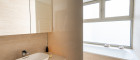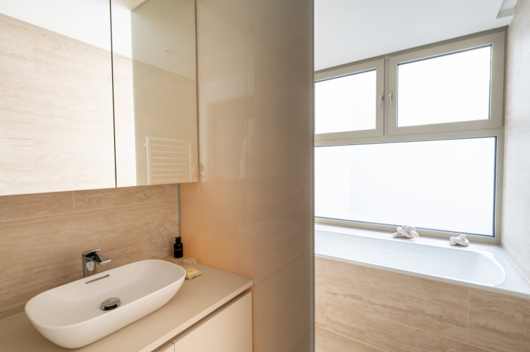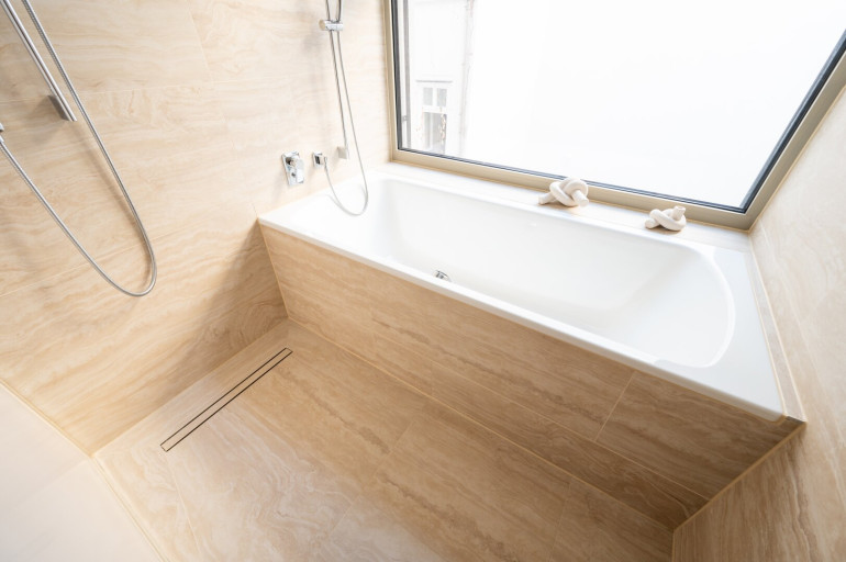 Das hochwertige Badezimmer verfügt über eine Badewanne, einen Spiegelschrank, indirekte Beleuchtung und eine separate Regendusche.