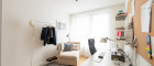 Im zweiten, derzeit als Büro genützten Zimmer, in welchem auch MIELE Waschmaschine und Trockner in einem platzsparenden Einbauschrank untergebracht sind, besticht durch große Fensterflächen und Ruhe in den Innenhof. Hier ermöglichen die Installationen auch ein Gästezimmer.