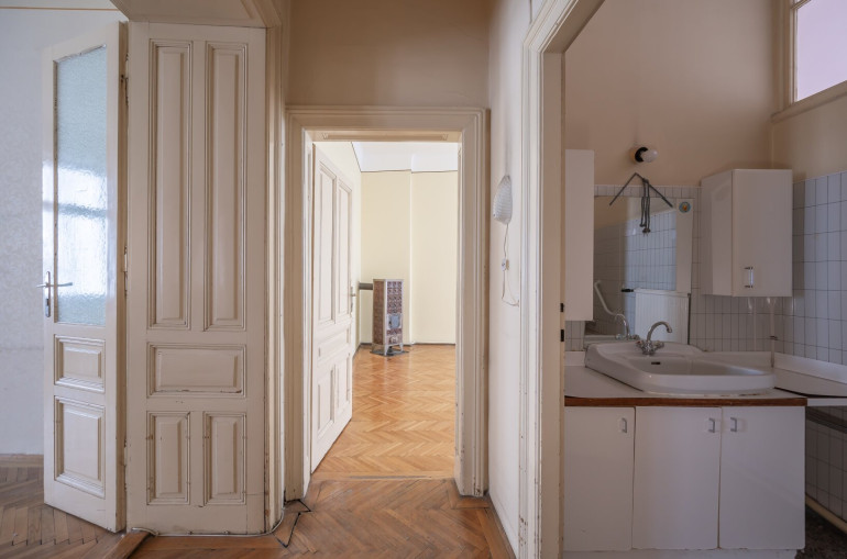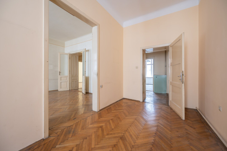 Die Wohnung befindet sich im 2. Stock (ohne Lift) und in einem sanierungsbedürftigen Zustand. Sie bietet sehr viele Elemente eines Stilaltbaus: