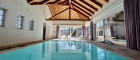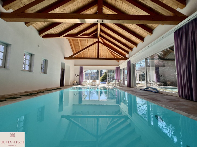 Im rechten Flügel der Villa liegt die lichtdurchflutete Schwimmhalle mit Ausgang auf die Sonnenterrasse. Hier können Sie vom Alltag fliehen und entspannen. Mit dem Saunabereich und dem Fitnessraum können Sie das komplette Wellnessprogramm genießen. Der schön angelegte Garten ist ein Kraftplatz, egal ob Kinder spielen oder Sie Ruhe beim Meditieren finden.