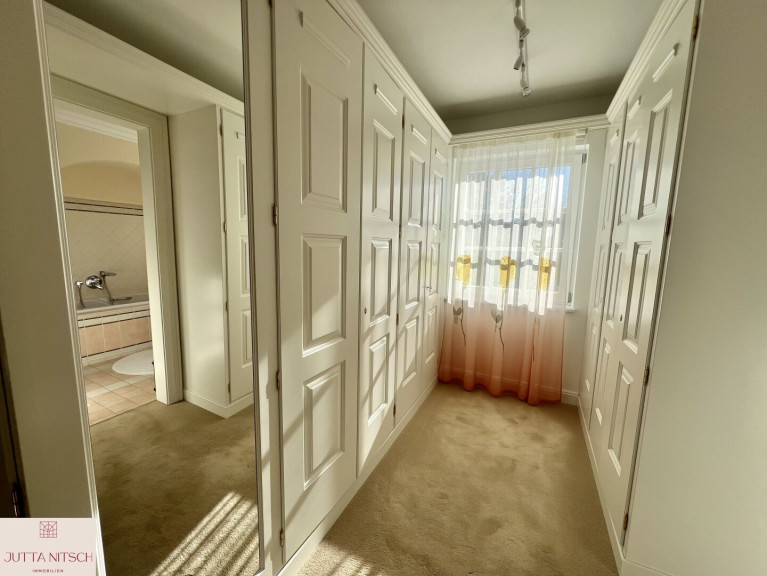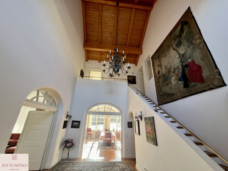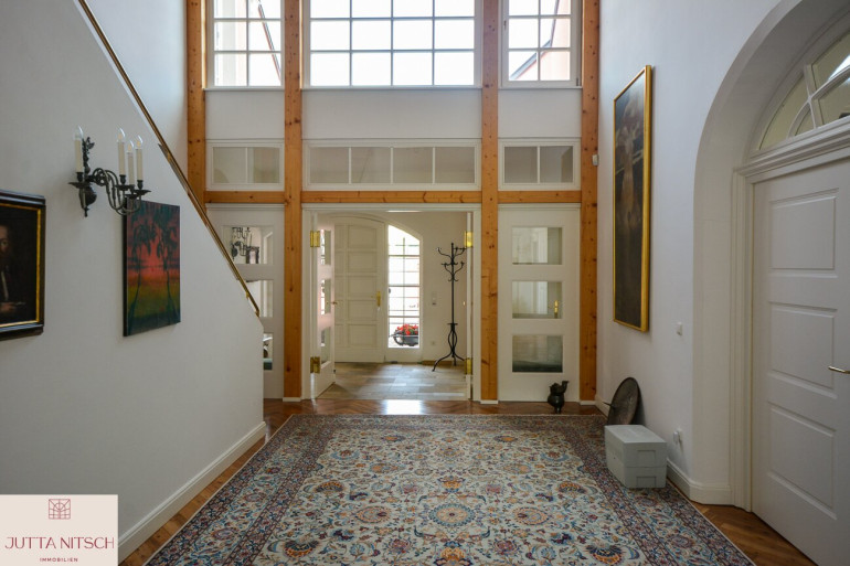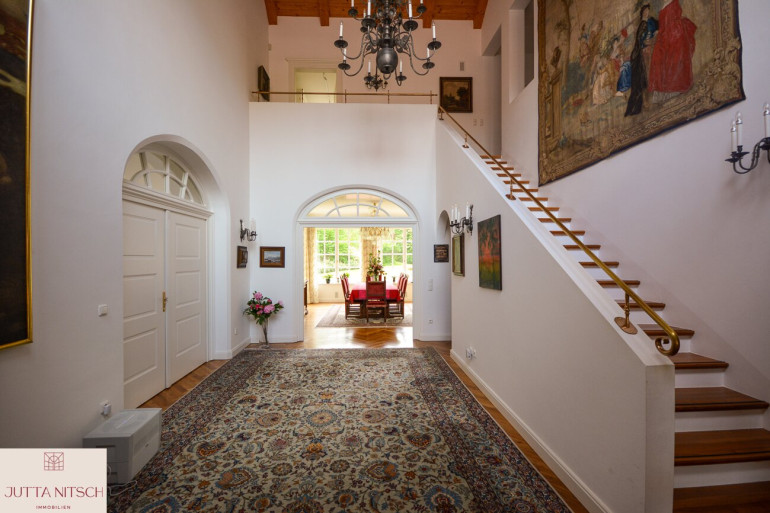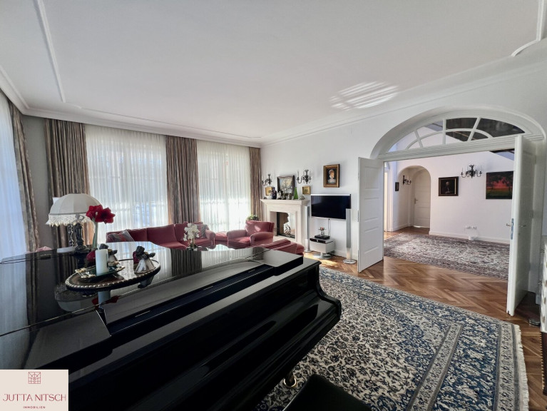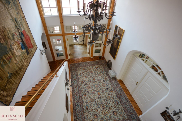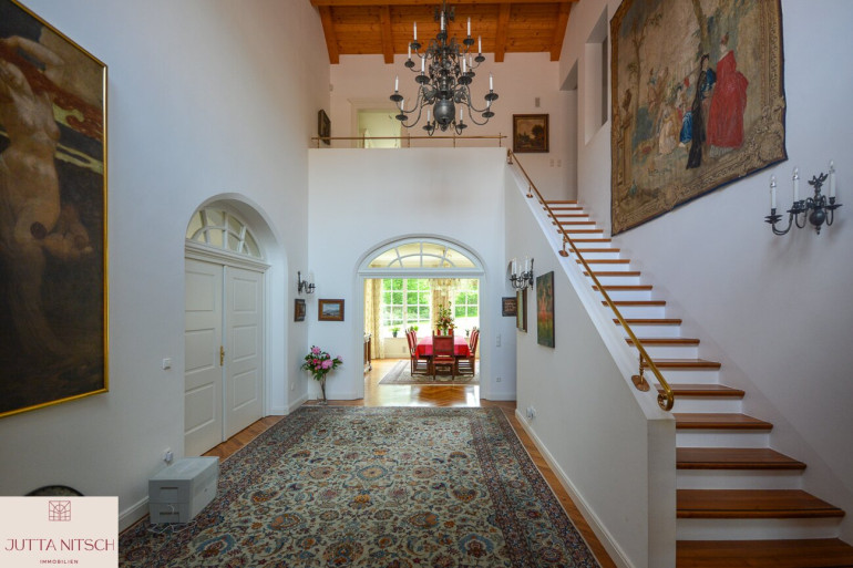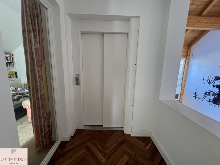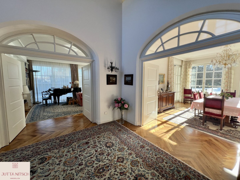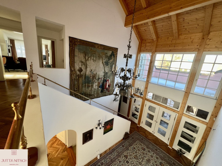 Beim Betreten der imposanten Villa gelangen Sie über ein stilvolles Entrée mit Natursteinboden in ein imposantes Atrium mit einer beeindruckenden Bildergalerie und einem offenem Stiegenaufgang in das Obergeschoß wo sich der Privatbereich befindet. Durch den eingebauten Personenlift ist die Villa barierefrei.
