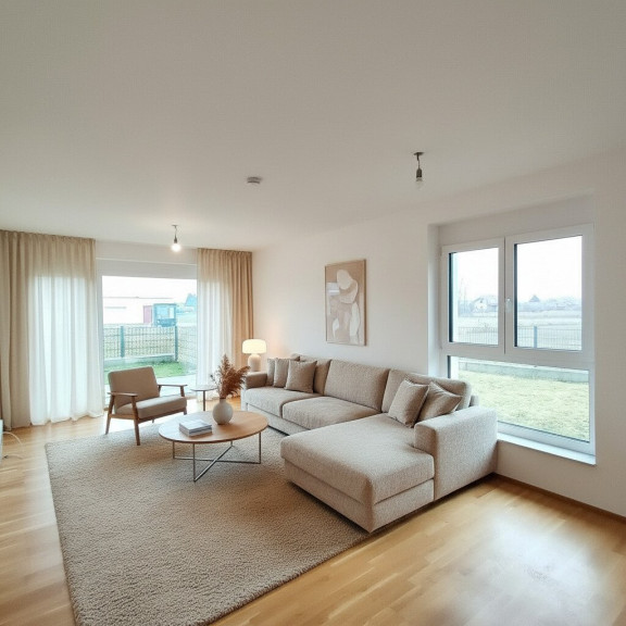 Die schicke 3-Zimmerwohnung im Erdgeschoss betritt man durch den gepflegten Eingangsbereich, welcher ausreichend Platz für eine Garderobe sowie den zentralen Zugang zu allen Räumlichkeiten der Wohnung bietet. Unmittelbar links vom Eingangsbereich befindet sich das Badezimmer mit Badewanne und einem seperat angelegten WC. Beide Nassräume sind durchgehend mit modernen Fließen ausgestattet. Ein Abstellraum schafft Stauraum für nützliche Alltagsgegenstände. Die beiden Schlafräume sind ca. gleich groß, wobei sich als Master-Bedroom das rechte auszeichnet, da es eine Spur größer ist. Der zweite Schlafraum bietet sich idealerweise als Büro an, z.B. um Homeoffice zu betreiben. Der Wohn- Essbereich ist mit einer Einbauküche sowie modernen Gerätschaften ausgestattet. Die großen Fenster sorgen für viel Licht im Wohnraum,der helle Parkett lässt den Raum offen und freundlich wirken. Die sonnige, idyllische Terrasse gewährt mitsamt einer Gartenfläche von 43,00m² Ruhe und Erholung und hat eine angenehme Größe für einen geselligen Grillabend.