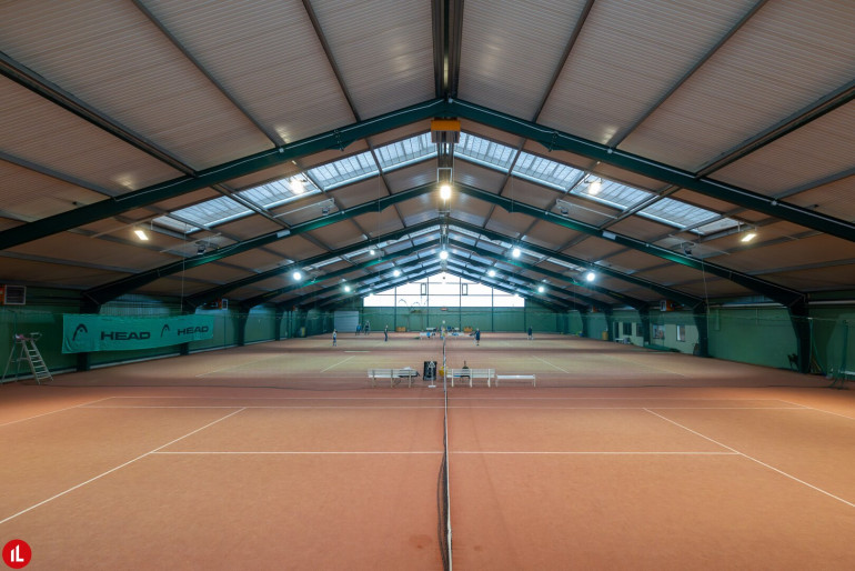 Die Tennishalle ist ca. 4,5-11 m hoch und verfügt über ein Tor