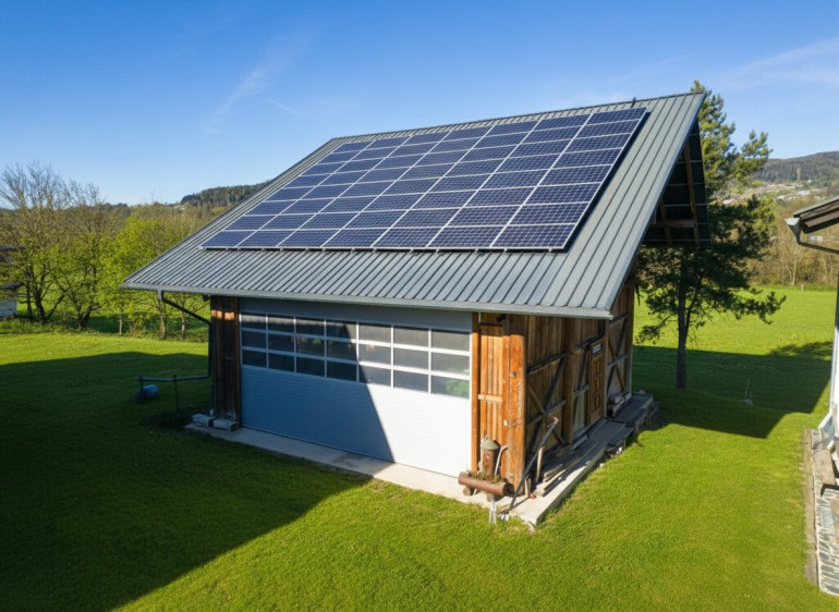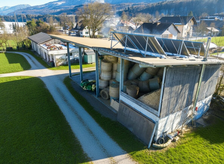 Mehrzweck-Unterstand (160 m²): Perfekt für die Lagerung von Heuballen, Pellets oder als geschützte Stellfläche. Inklusive direkt angebundenem Heizraum (11 m²).