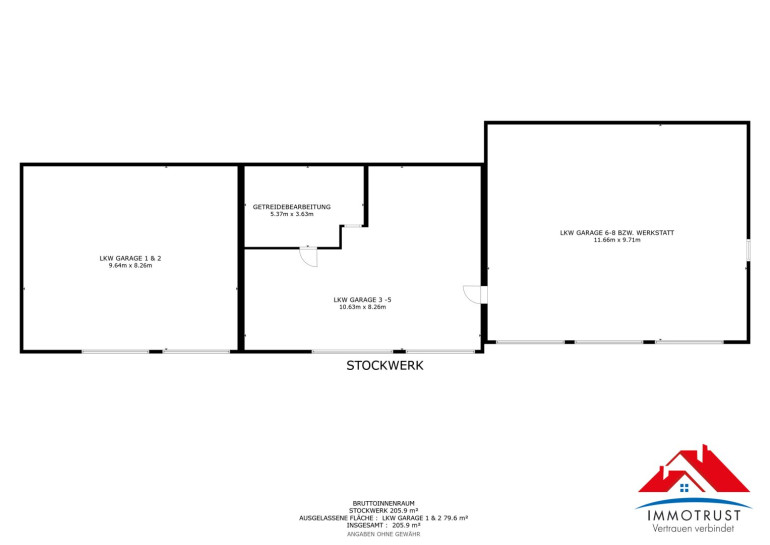 Lagerhalle 1 (280 m²): Aufgeteilt in drei große Garagen (79,6 m², 87,8 m² und 113,6 m²). Ideal für KFZ-Unterstellung, LKW-Stellplätze oder einen Werkstattbetrieb.
