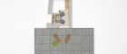 - getönte Glasscheibe mit Durchsicht von Küche in Wohnzimmer mit indirekter Beleuchtung und Steine in Diamantenoptik