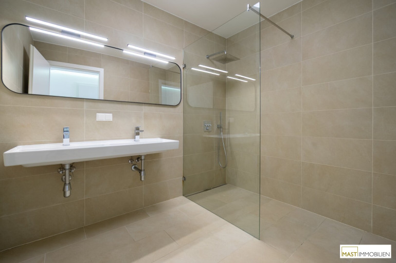 - ebenerdige Wasserfall-Dusche mit GROHE Smart Control Amateur und Doppelwaschbecken