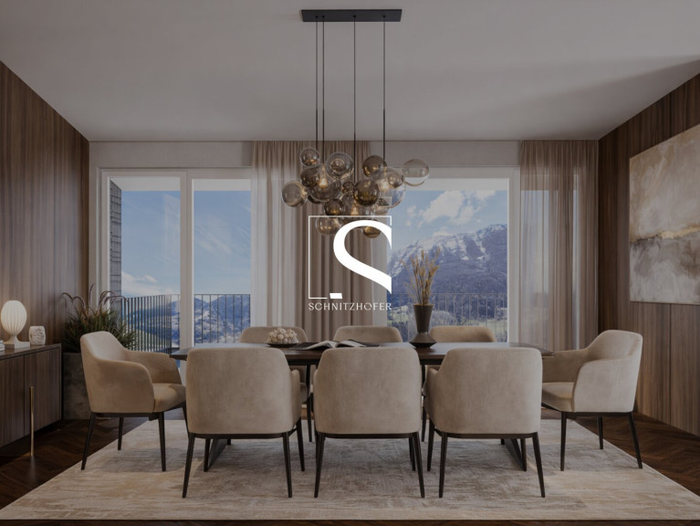 Nach der Ankunft parken Sie Ihr Auto bequem in der hauseigenen Tiefgarage. Für das Penthouse sind zwei optionale Tiefgaragenstellplätze reserviert. Von dort bringt Sie der Aufzug komfortabel nach oben – direkt in Ihre Wohnung. Beim Betreten empfängt Sie ein einladender Vorraum mit ausreichend Platz für Ihre Garderobe. Vom Vorraum betreten Sie das Herzstück der Wohnung: Ein großer Wohn- und Essbereich mit bis zu ca. 4 Metern Raumhöhe. Hier findet eine große Küche mit Kochinsel, ein Sofabereich und ein eleganter Essbereich Platz. Hinter der Küche geschickt positioniert befindet ein Abstellraum und ein Büro-Arbeitsbereich. Dank der Lage im Dachgeschoss des Hauses genießen Sie nahezu 360° Blick auf die Bergwelt. Die Natur holen Sie sich durch eine Dachterrasse mit Süd-Ausrichtung und einem Ost-Balkon in Ihren Wohnraum herein.