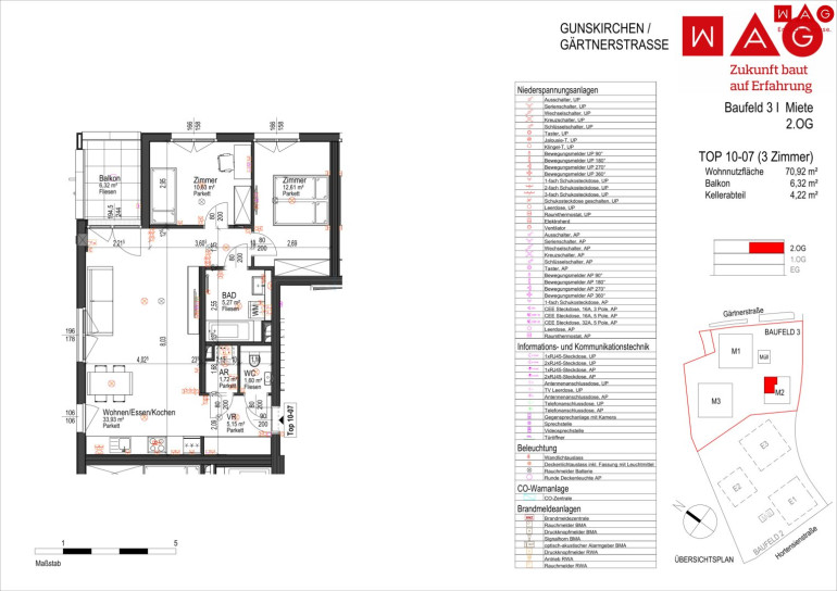 Am ehemaligen Sportplatz in der Gärtnerstraße in Gunskirchen errichtet die WAG drei moderne Wohngebäude mit insgesamt 60 geförderten Mietwohnungen und einer Tiefgarage mit 81 Stellplätzen. Die Anlage entsteht in nachhaltiger Hybridbauweise und bietet Wohnraum für unterschiedliche Lebenssituationen.