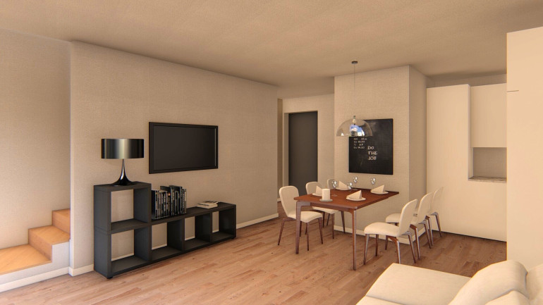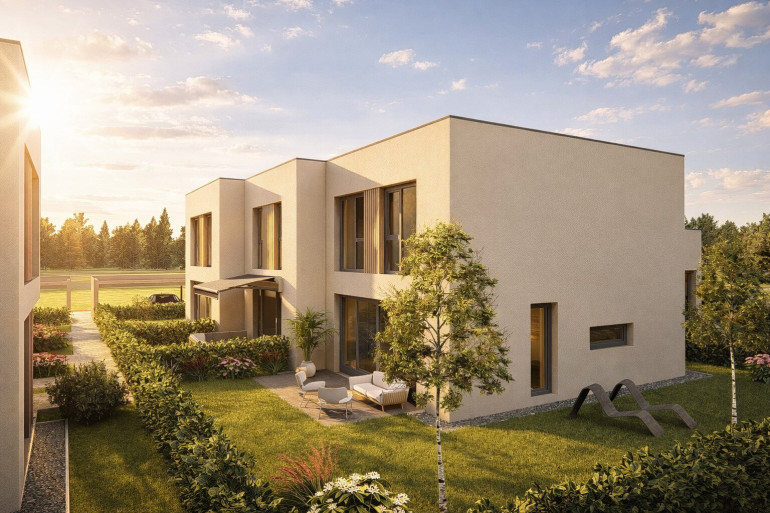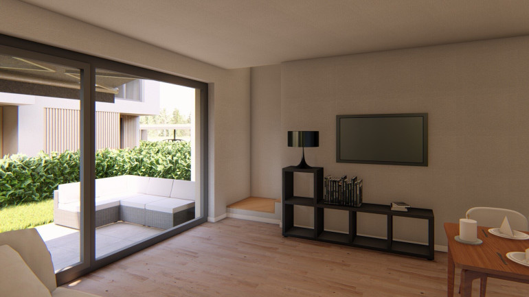 Die Wohnung befindet sich im Mittelteil eines kleinen Mehrparteienhauses mit nur insgesamt drei Wohneinheiten, als Teil einer kleinen, derzeit in Errichtung befindlichen Siedlung. Jedes der vier kleinen Mehrparteienhäuser dieser feinen Siedlung wird autonom und unabhängig von den anderen Gebäuden errichtet, dies ist durch jeweils eine eigene Luftwärmepumpe und einem eigenen Wasserbrunnen möglich, somit können die Betriebskosten genau und kostengünstig auf die Bedürfnisse der Bewohner abgestimmt werden.