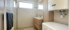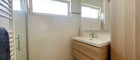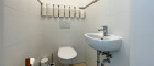 Das Badezimmer überzeugt mit moderner Ausstattung, darunter eine Glasdusche und ein Handtuchwärmer, und bietet ebenfalls viel Licht und ein angenehmes Raumgefühl. Direkt daneben befindet sich eine separate, geräumige Toilette.