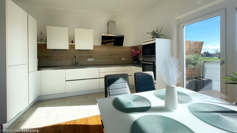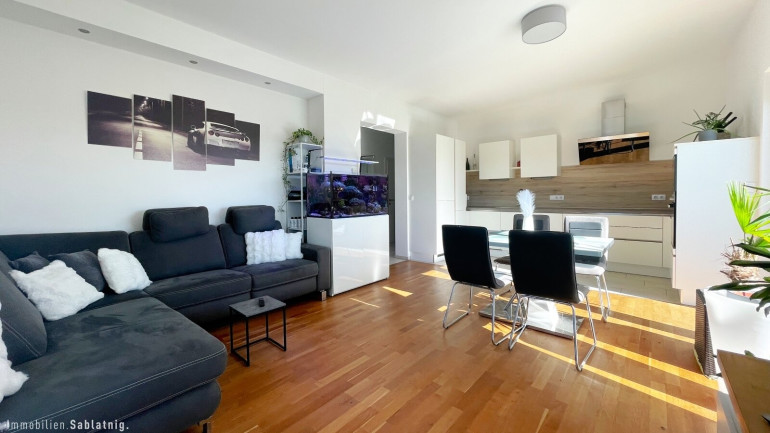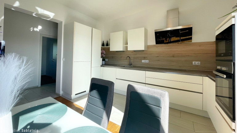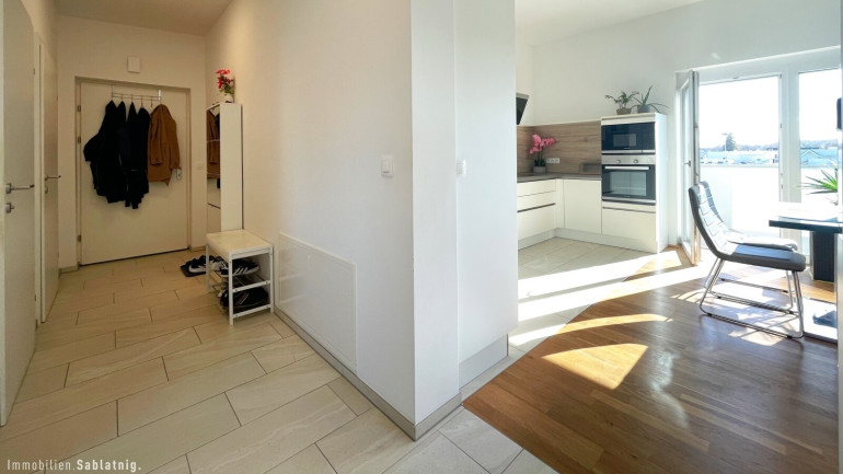 Alle Wohnräume sind mit edlem Parkettboden ausgestattet, der ein elegantes und einladendes Ambiente schafft. Der helle und großzügige Vorraum führt direkt in den weitläufigen Wohn- und Essbereich, der harmonisch mit der Küche verbunden ist – eine stilvolle Integration, die modernes Wohnen mit Funktionalität vereint.
