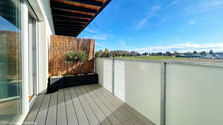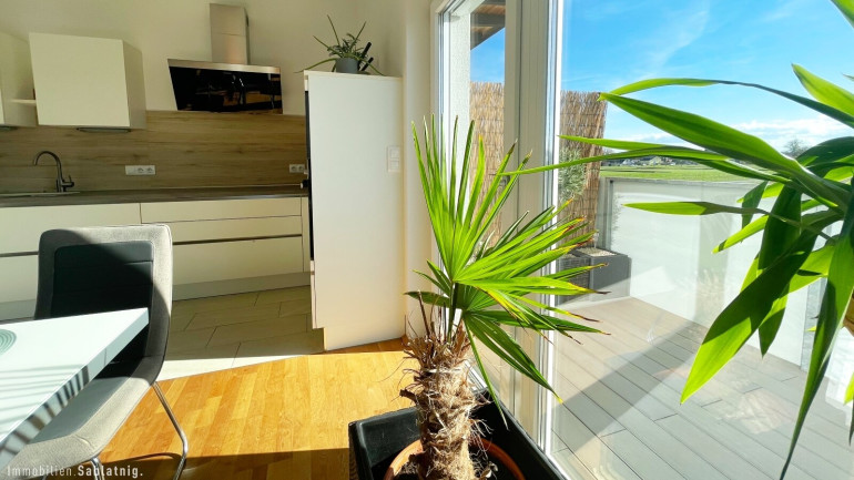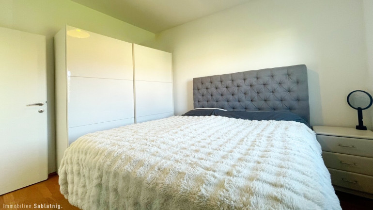 Vom Wohnbereich gelangen Sie auf die sonnige Südwest-Terrasse, die zum Verweilen und Genießen einlädt. Die durchdachte Raumaufteilung sorgt für fließende Übergänge und maximale Wohnqualität. Der Schlafbereich ist ebenso lichtdurchflutet und großzügig geschnitten, während ein weiteres Zimmer flexibel nutzbar ist – ideal als Kinder-, Arbeits- oder Gästezimmer.