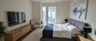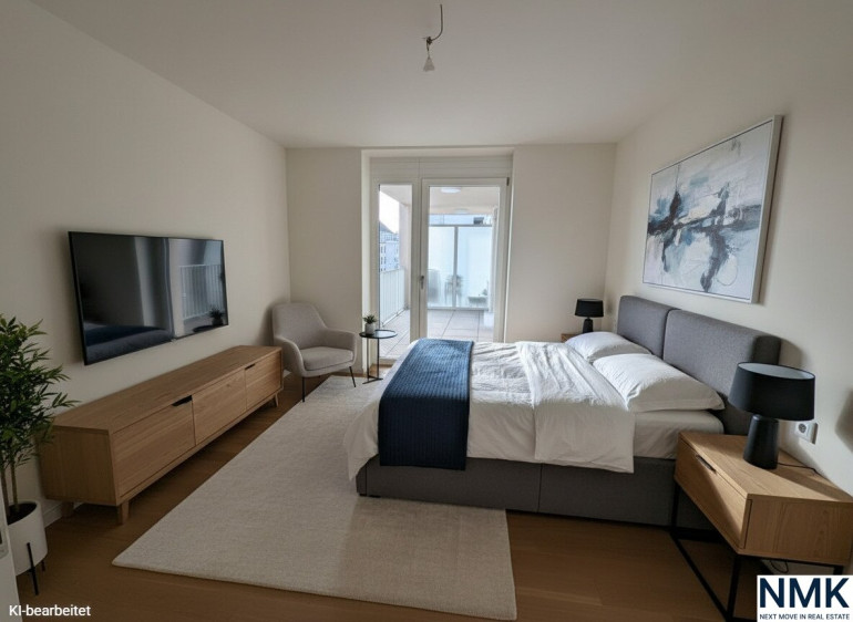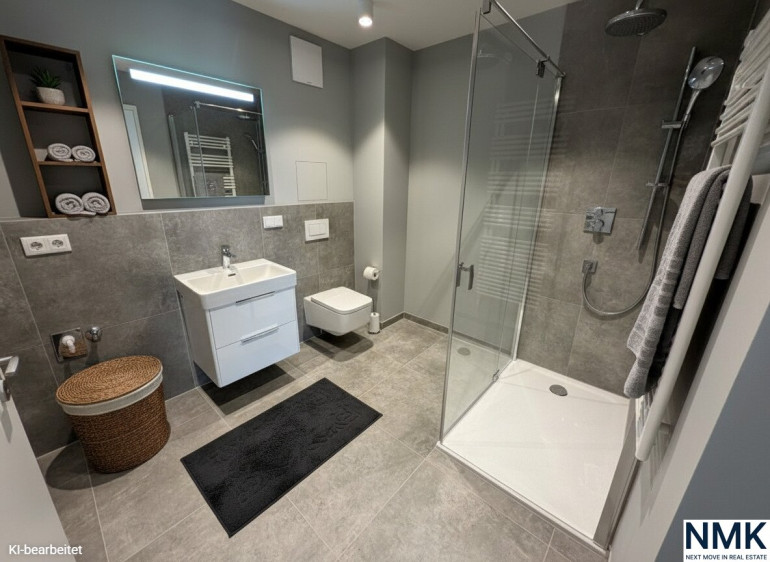 Das Schlafzimmer bietet einen ruhigen Rückzugsort, während das Badezimmer mit Waschbecken, Dusche und WC funktional und stilvoll ausgestattet ist. Der durchdachte Grundriss nutzt jeden Quadratmeter optimal und macht diese Einheit sowohl für Eigennutzer als auch als Investment besonders attraktiv.