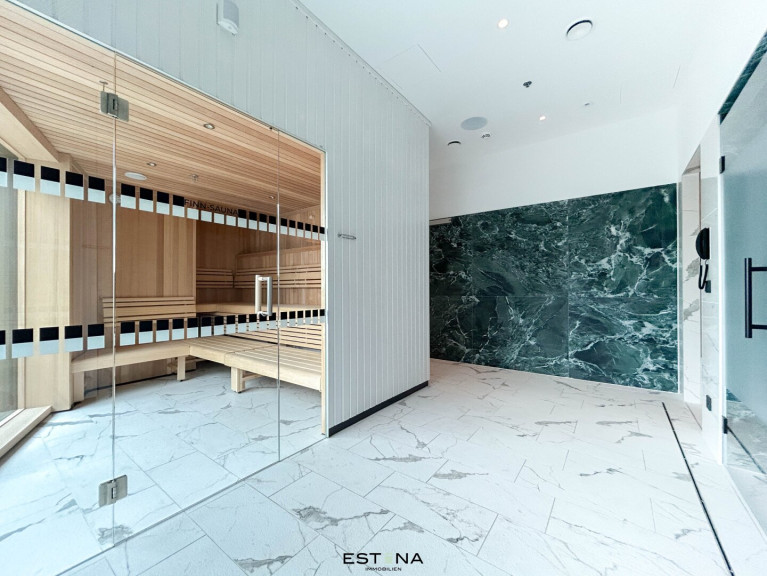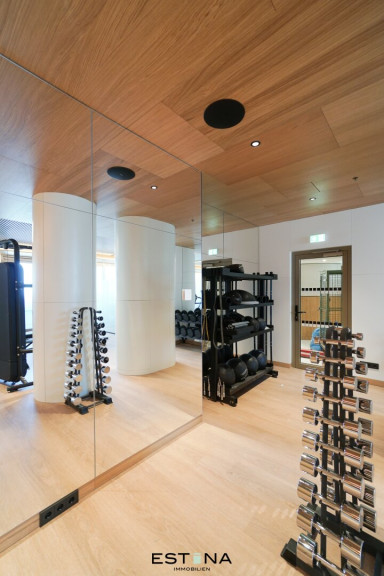 Parkett, Fliesen, Fernwärme, Einbauküche, Wohnküche / offene Küche, Personenaufzug, Ostbalkon, Dusche, Wachdienst, Tiefgarage, Sauna, Swimmingpool