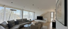 Im Obergeschoß befindet sich das Wohnzimmer mit offenem Kamin, einem eleganten Roche-Bobois Ledersofa und ein moderner gebogener Samsung 65 Zoll Fernseher und Bose Surround Lautsprecher.