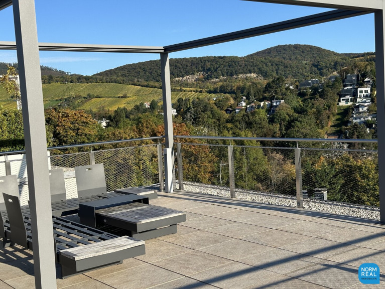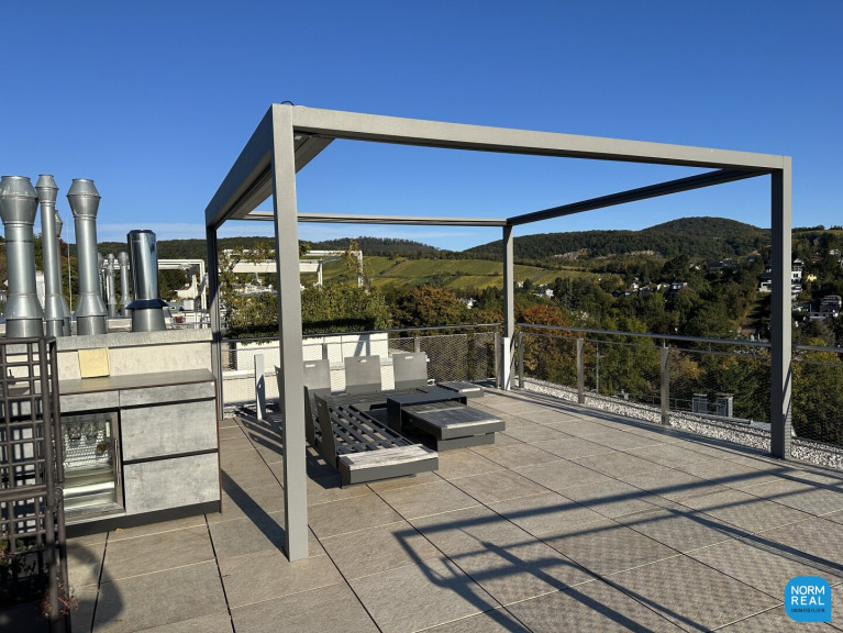 Auf der großen Dachterrasse mit traumhaftem Wienblick befindet sich eine outdoor Küche mit Waschbecken und Kühlschrank . Die bequeme Outdoor- Sitzgarnitur ist durch eine Pergola mit automatischem Stoffdach geschützt und bietet dadurch eine gemütliche Atmosphäre an lauen Sommerabenden.