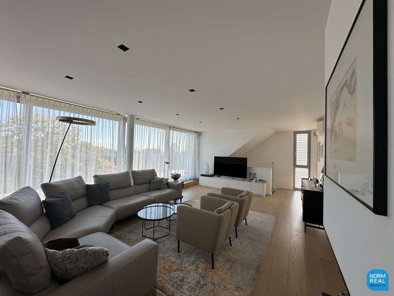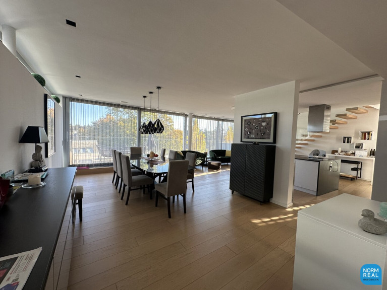 Die hochwertige Ausstattung der Wohnung lässt keine Wünsche offen. Die Dielen, Fliesen und Parkettböden sorgen für ein elegantes und gemütliches Ambiente. Die ganze Wohnung lässt sich durch ein I-Pad steuern. Es gibt eine zentrale Musikanlage mit Lautsprechern in allen Räumen und auf den Terrassen, alle Zimmer haben Klimaanlage. Auch die Heizungs- und Lichtsteuerung sowie der außenliegenden Raffstores erfolgt über das I-Pad.